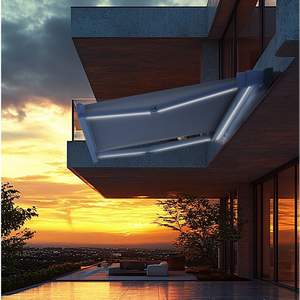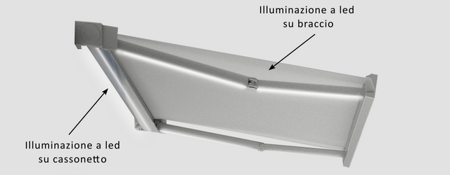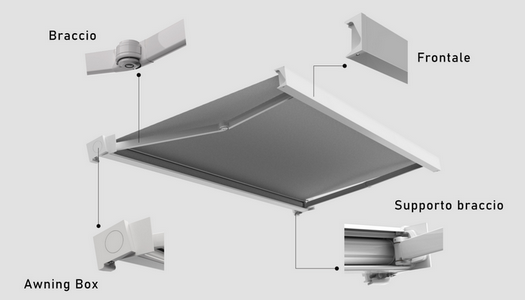 Il design moderno è arricchito da un braccio con fascia tessile coperta da un carter. La regolazione stabile dell’altezza del braccio assicura una chiusura perfetta dell’Awning Box, mentre la sua compattezza e la forma squadrata creano un design discreto ed elegante.