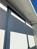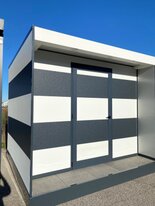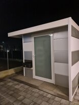 La casetta Sagittarius può essere personalizzata aggiungendo tettoie a copertura fissa, anche con pannelli fotovoltaici, o pergole bioclimatiche.