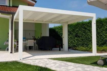 La pergola LIBRA PANEL è realizzata con una struttura in alluminio e si caratterizza dalla copertura con pannelli coibentati bianchi realizzati con due strati di lamiera ed uno strato di isolante nel mezzo.
